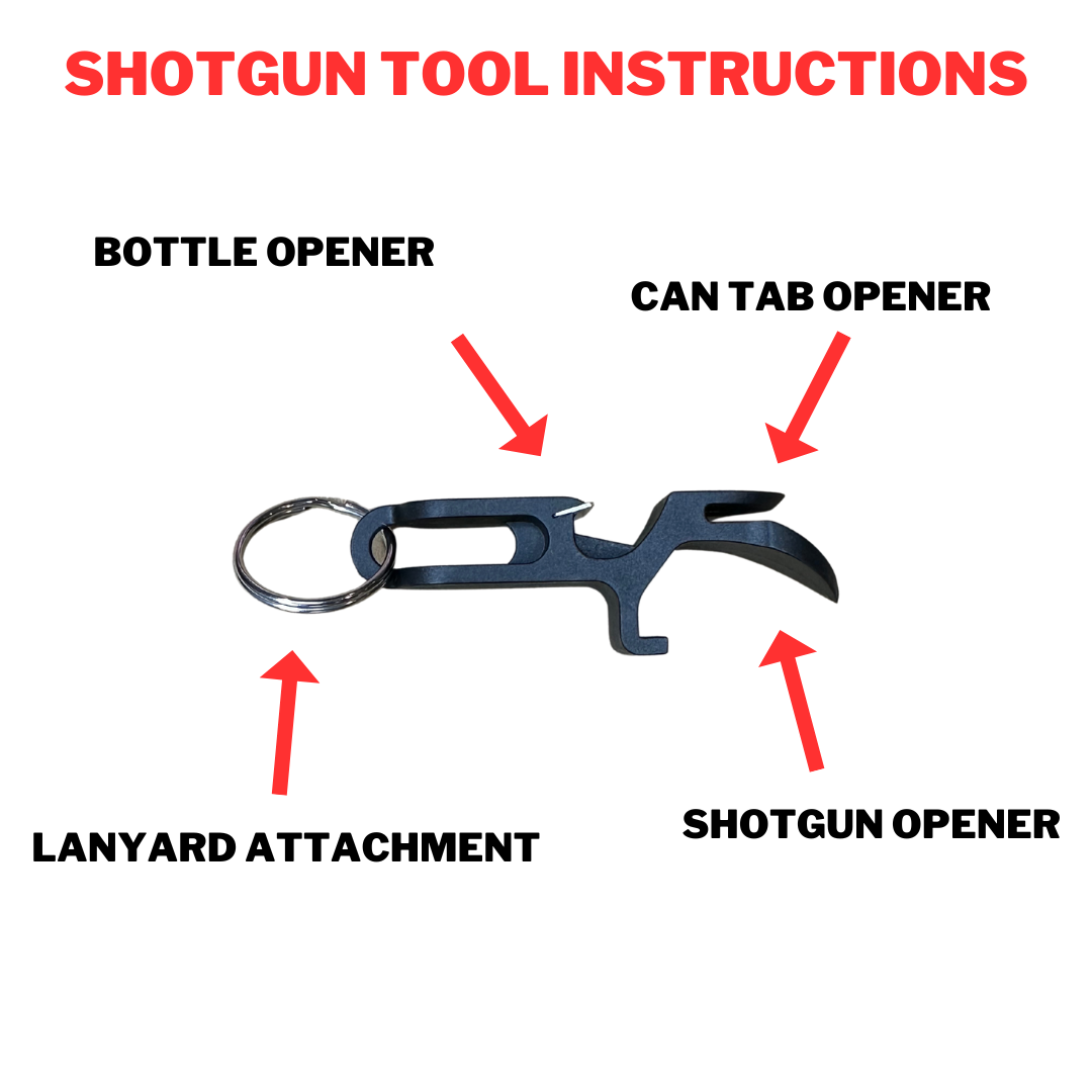Keychain shotgun tool w/ bottle opener and can tab opener and key ring.